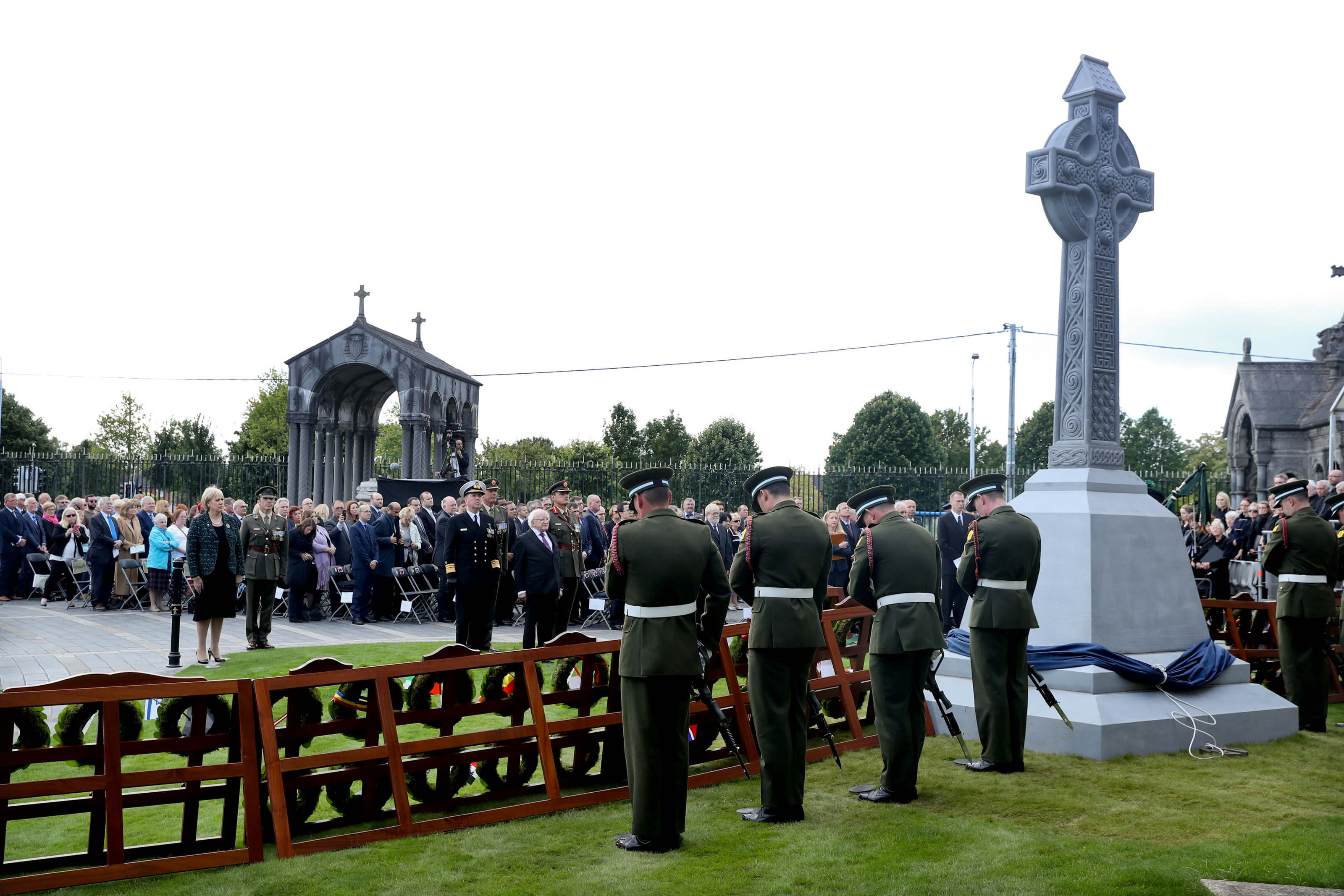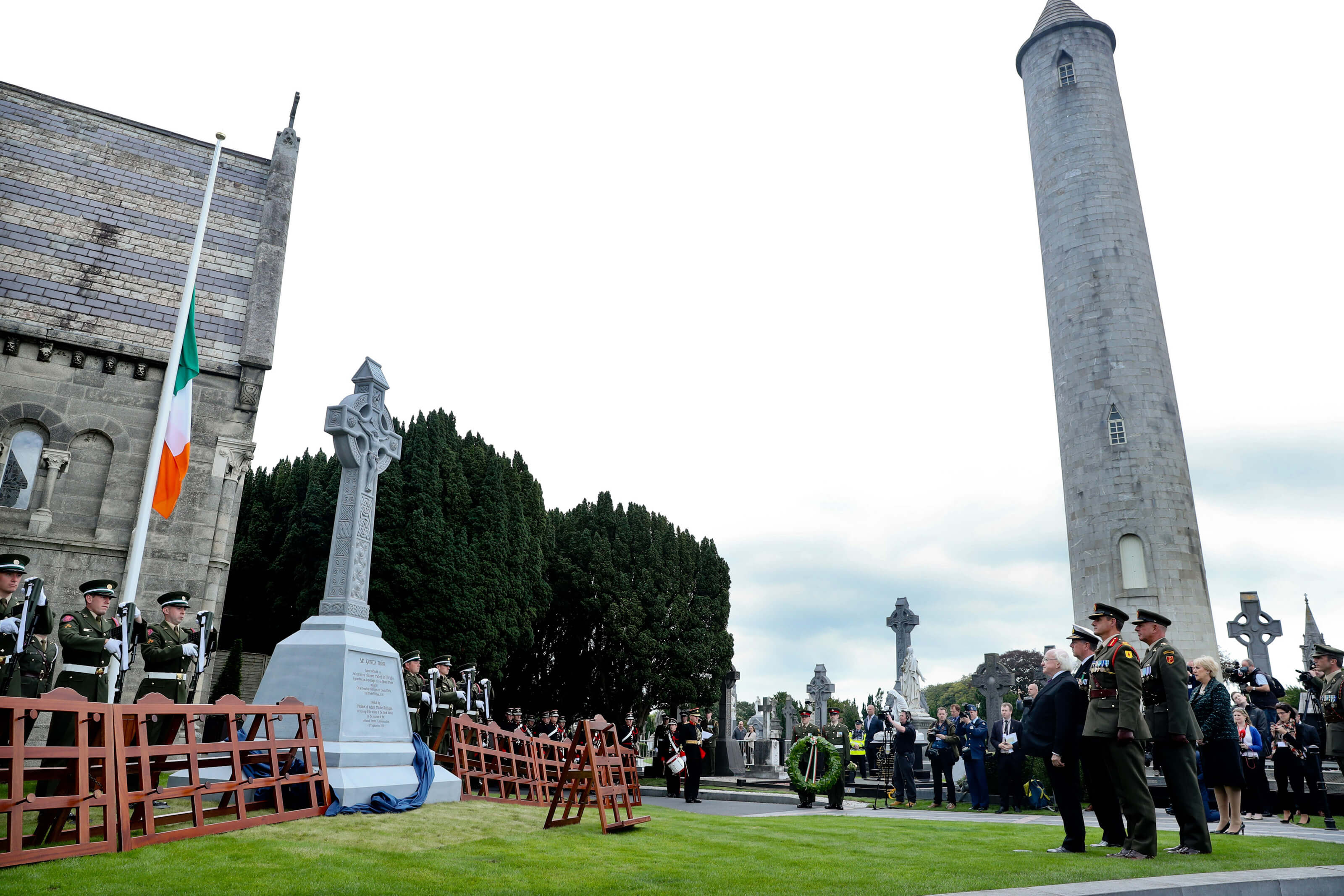 The President unveiled a new memorial to honour those who died during the famine in Ireland 1845 – 1852. The memorial consists of a 19th century Celtic cross, donated by the Glasnevin Trust, and which the President said will serve as a permanent memorial to, and reminder of, the victims.