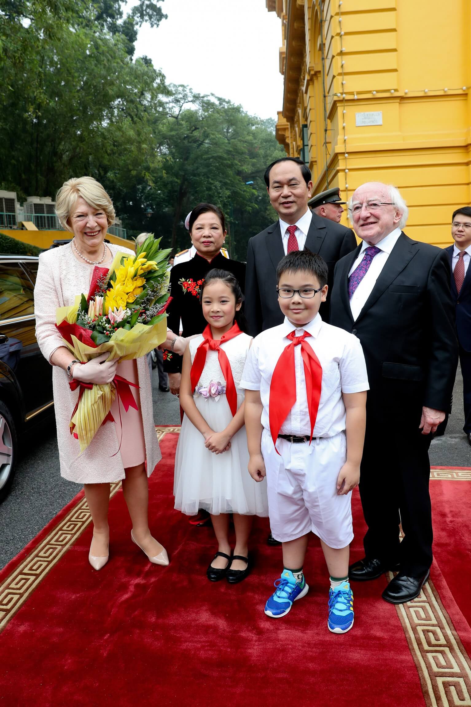 The President and Sabina Higgins were greeted by President Tran Dai Quang and his spouse, Madame Nguyen Thi Hien, and flowers were presented by two children. The national anthems of Ireland and Vietnam were played, before both Presidents reviewed a Guard of Honour.