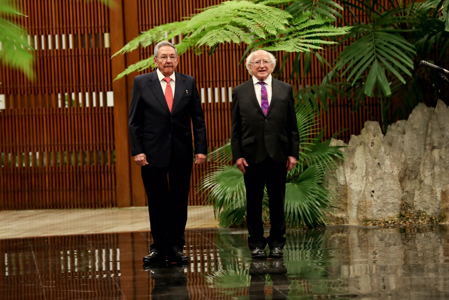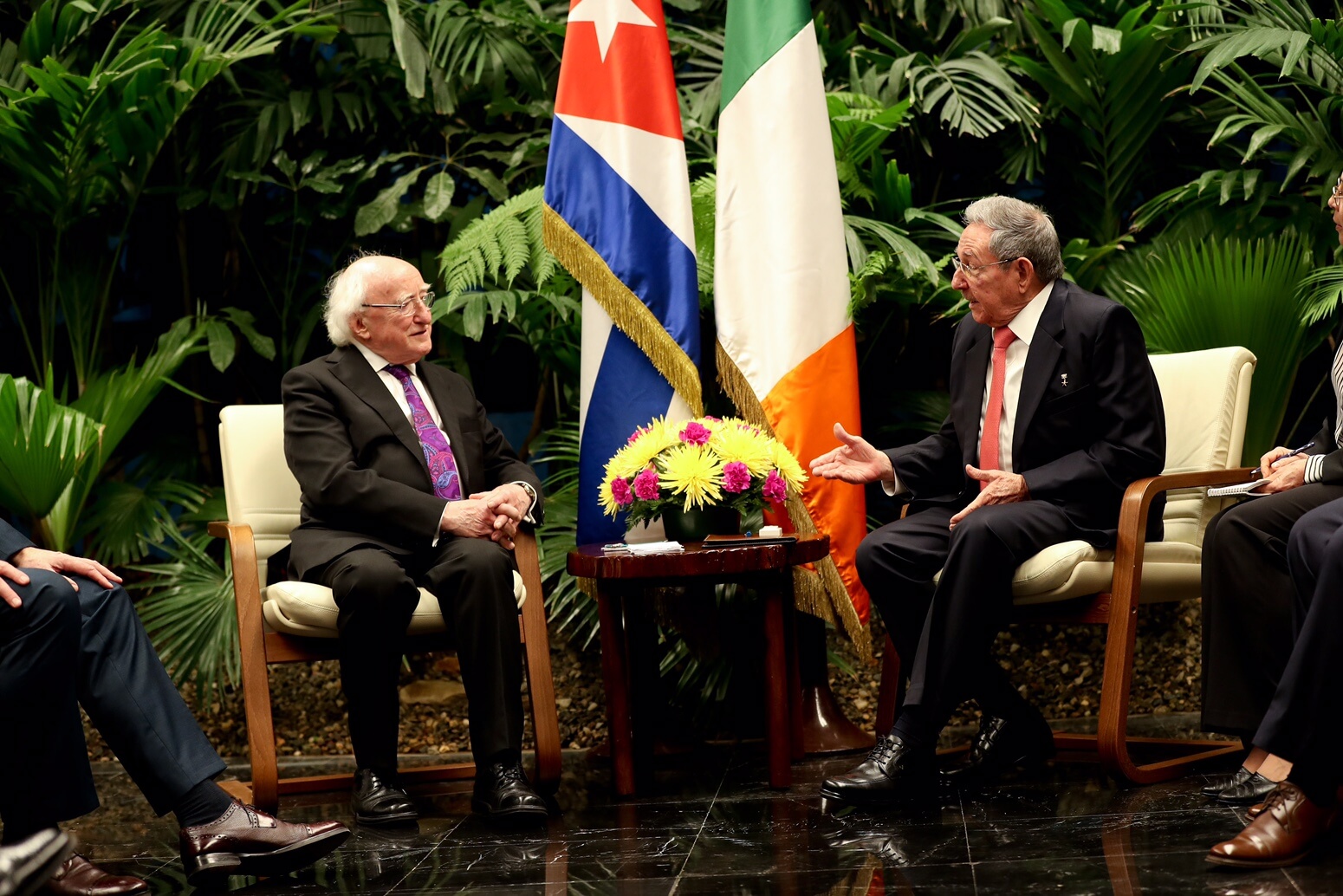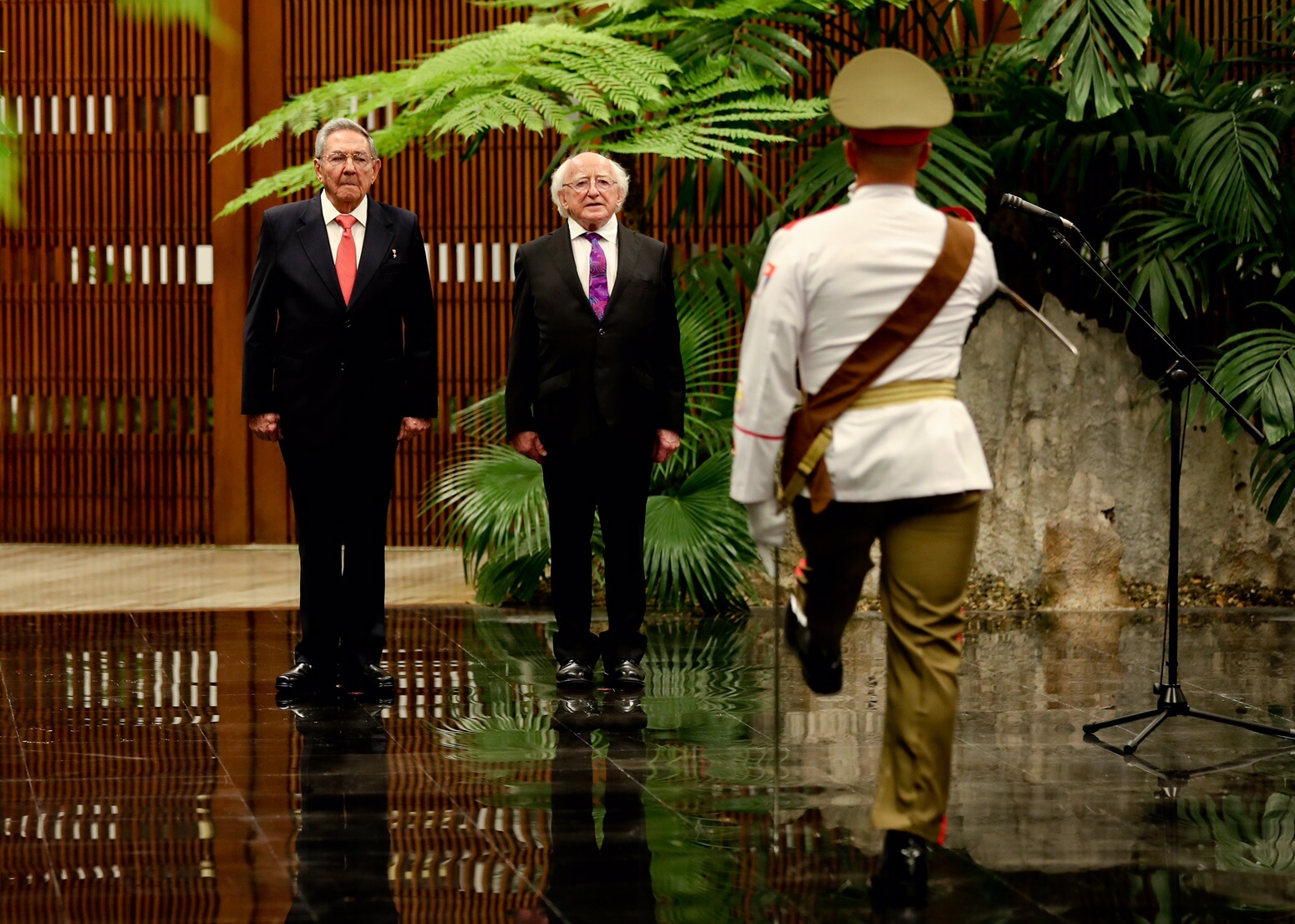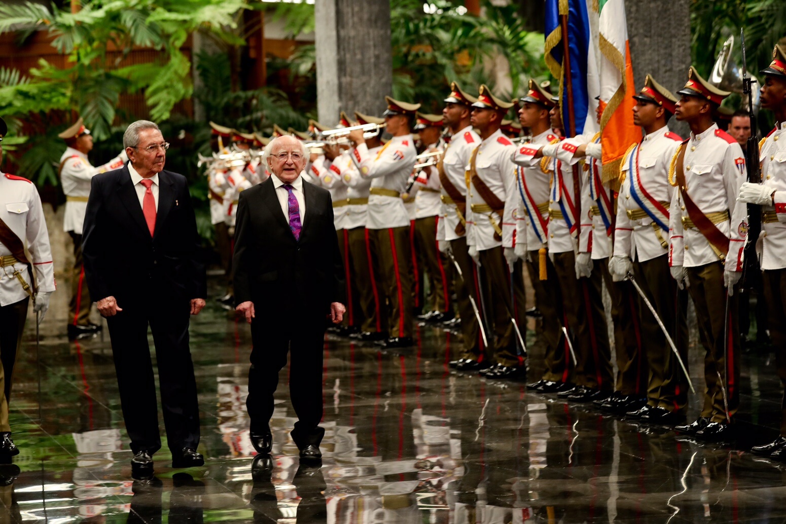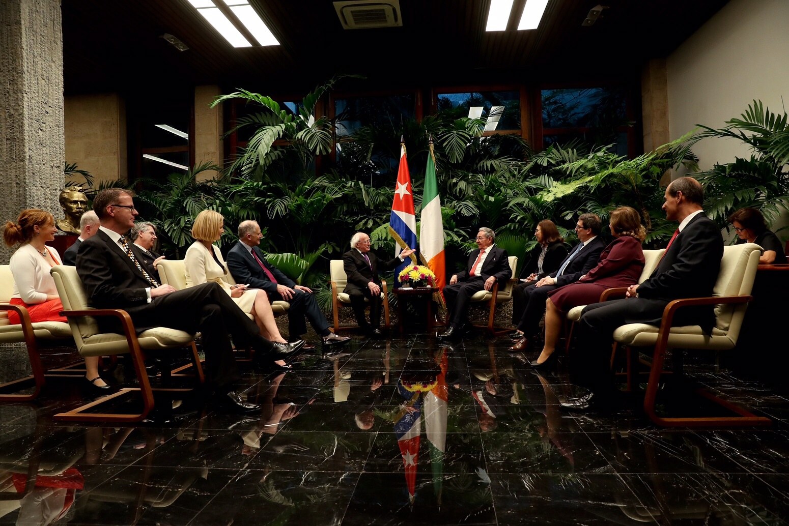 Tar éis dó bláth-fhleasc a leagadh ag Leacht José Martí, chuir Uachtarán Chúba Raúl Castro fáilte oifigiúil roimhe i bPálás na Réabhlóide